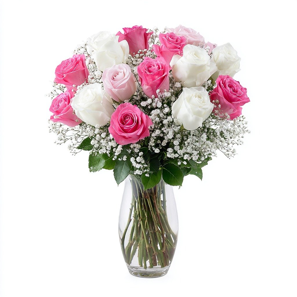 This meticulously crafted arrangement showcases the unique beauty of each rose. The white roses symbolize purity and innocence, making them ideal for new beginnings or expressing sympathy. Pink roses convey gratitude, admiration, and joy, perfect for thanking a friend or celebrating a special occasion. The lavender roses add a touch of enchantment and mystery, representing love at first sight and making them a thoughtful gesture for a romantic partner. Together, these colors create a harmonious blend that speaks volumes.