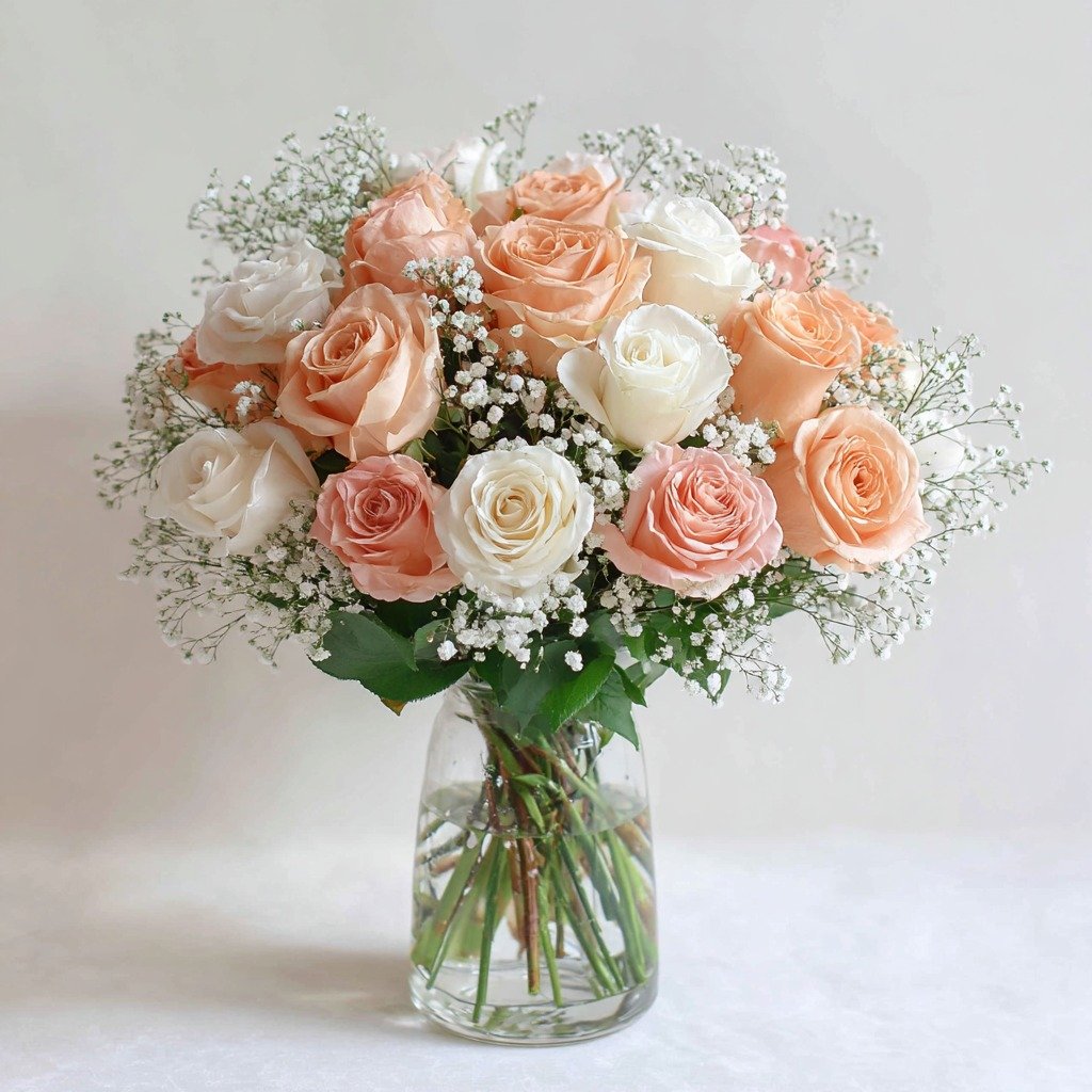 The bouquet is thoughtfully arranged, blending the soft hues of white and peach roses with the delicate accents of baby’s breath to create a stunning visual display. Whether presented in a sleek vase or held together with elegant wrapping, the arrangement is crafted to radiate charm and sophistication. Delivering beauty in every petal, this bouquet ensures your thoughtful gesture will not go unnoticed.