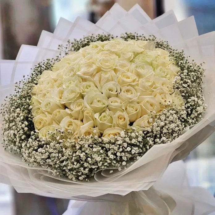 Indulge in the luxury of nature’s finest with our Fifty White Roses with Baby’s Breath Bouquet. This exquisite flower arrangement embodies sophistication and refinement, making it a perfect choice for any occasion. Whether you’re celebrating a wedding, anniversary, or expressing your heartfelt sentiments, this bouquet is a timeless symbol of purity and love.Each bouquet is meticulously handcrafted to ensure every white rose is in perfect bloom. Complemented by delicate sprigs of baby’s breath, the arrangement strikes the right balance of fullness and elegance. The soft, velvety petals of the white roses are a testament to their premium quality, while the baby’s breath adds a touch of airy charm, creating a visual masterpiece.