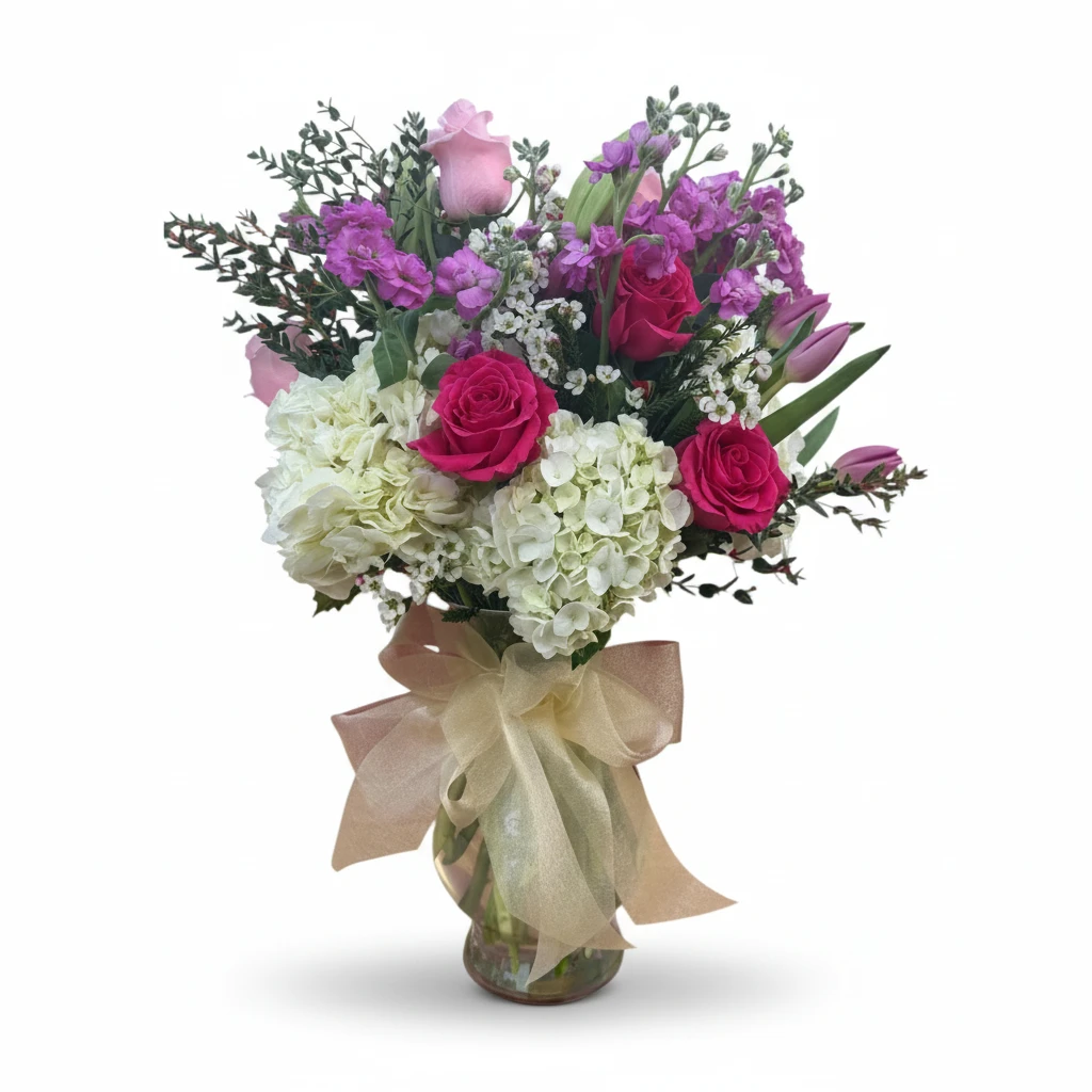 Our floral arrangement features a stunning selection of fresh blooms, delicately handpicked to guarantee vibrancy and elegance. Designed to suit any occasion, the arrangement adds warmth and charm to any space, making it an ideal gift for spontaneous acts of kindness.
