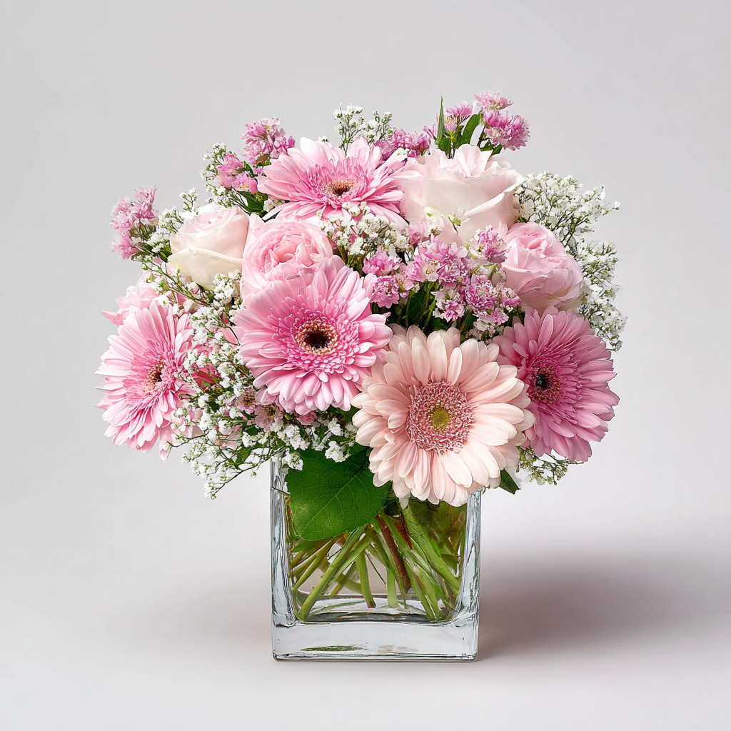Presented in a clear square glass vase, the stems are visible, highlighting the clean, modern aesthetic and allowing the full beauty of each flower to shine. Whether placed on a coffee table, desk, or bedside, “Pink Petal Dream” brings calm, charm, and uplifting energy into any space.