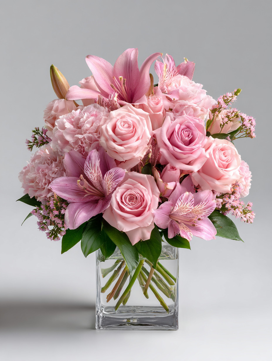 Delicate pink alstroemeria and ruffled pink carnations enhance the fullness and texture, while tiny sprigs of baby’s breath and fresh greenery frame the blooms naturally, creating a balanced, garden-fresh composition. The entire bouquet is presented in a clear square glass vase, allowing the stems to be seen and highlighting the clean, modern aesthetic.