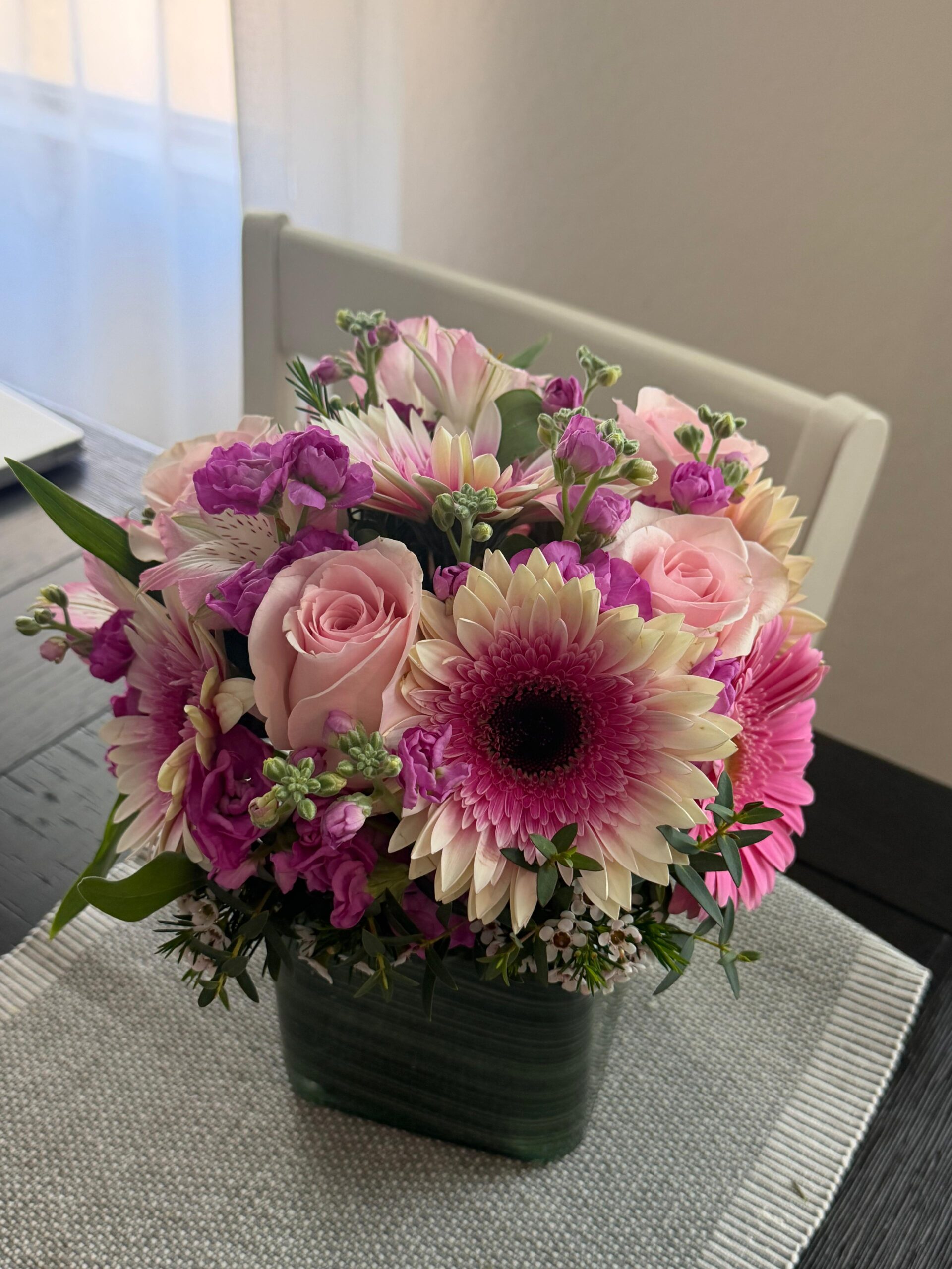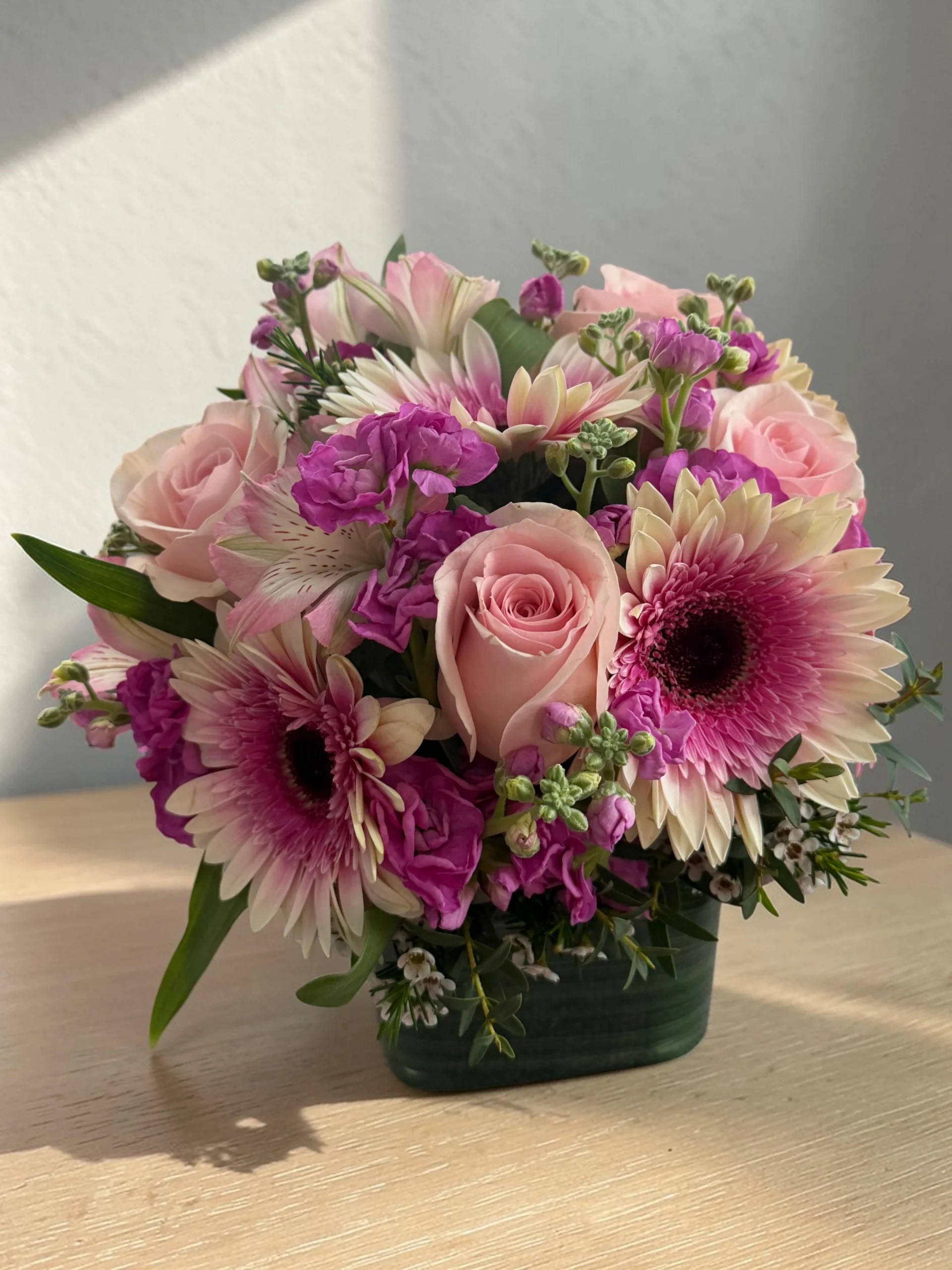 This arrangement showcases an exquisite blend of pastel shades, offering harmony and freshness. With every flower handpicked for its beauty, the result is an elegant centerpiece that stands out at weddings, celebrations, or everyday moments.