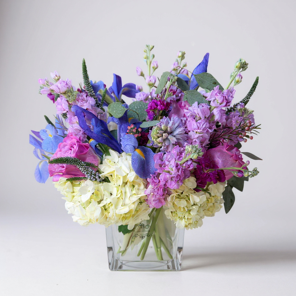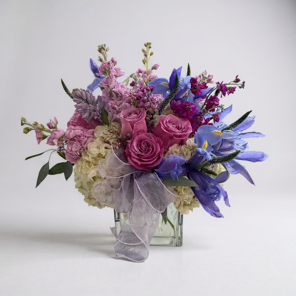 An enchanting symphony of rich purples and soft blush tones, this exquisite arrangement exudes timeless elegance and romantic charm. Crafted with meticulous attention to detail, each bloom is thoughtfully placed to create a harmonious cascade of color and texture. The gentle draping of sheer ribbon adds a touch of ethereal grace, making this bouquet perfect for celebrating love, marking special milestones, or simply indulging in luxury. Let its sophisticated beauty transform any space into a sanctuary of refinement and tranquility.